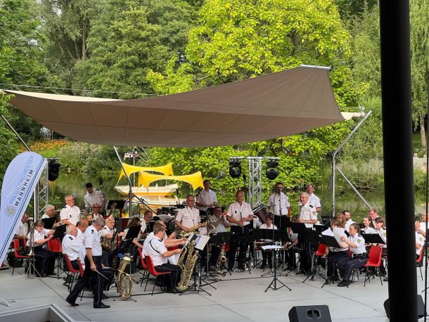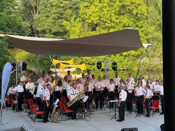 Abgesehen von einigen Windböen hielt auch das Wetter, was die Spielfreude der ca. 45 Musiker/innen zusätzlich anspornte. Anja Leukert führte gekonnt und informativ durch das umfangreiche Programm, angefangen von Olympic Spirit, über Fantasia on British Sea Songs, den Glacier Express, New York Overtüre, Pirates oft the Caribian und vielen weiteren Stücken wie z.B. Moment für Morricone, Kaiserin Sissi oder Phil Collins. Nach Elvis-The King hielt es die Zuhörer nicht mehr auf ihren Sitzen, es wurde sogar getanzt und die Solisten Markus Waltenberger an der Trompete, Oskar Jankowski am Alt-Sax und Claus Schleifenheimer am Tenor Sax rockten die Bühne. Die Zugabe Selections from Starlight Express aus dem gleichnamigen Musical rauschte über die Bühne, ein passendes furioses Finale.